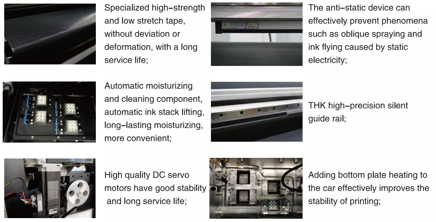 Configure four 13200-U1 print heads, adopt advanced board control technology, use 3.5pl ultra small ink dropletsand industrial grade design to ensure the durability of the print heads.