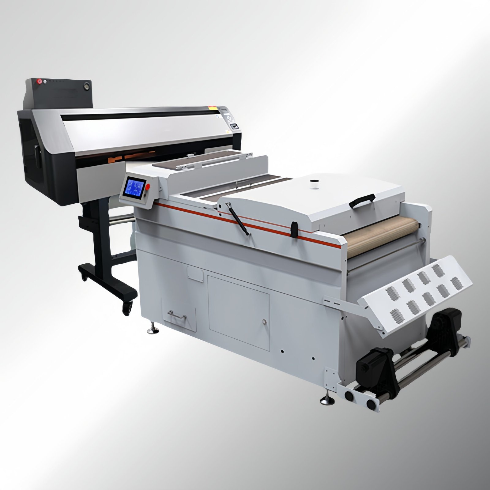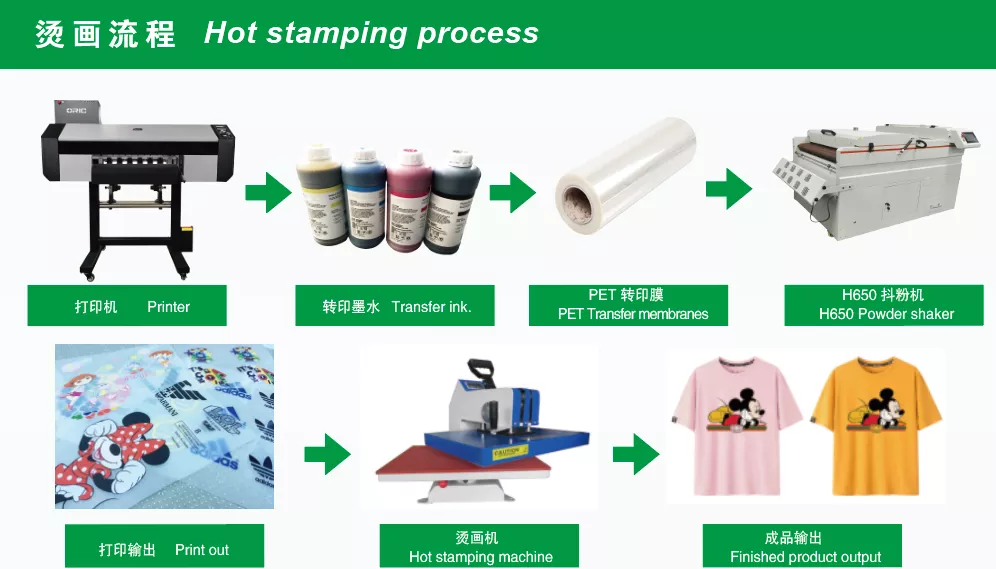 Digital PET Film Printing Machine with Powder Shaking integrates vinyl powder coating and drying into one machine. When the film/vinyl is dried out, it can be used to transfer print onto the garment.