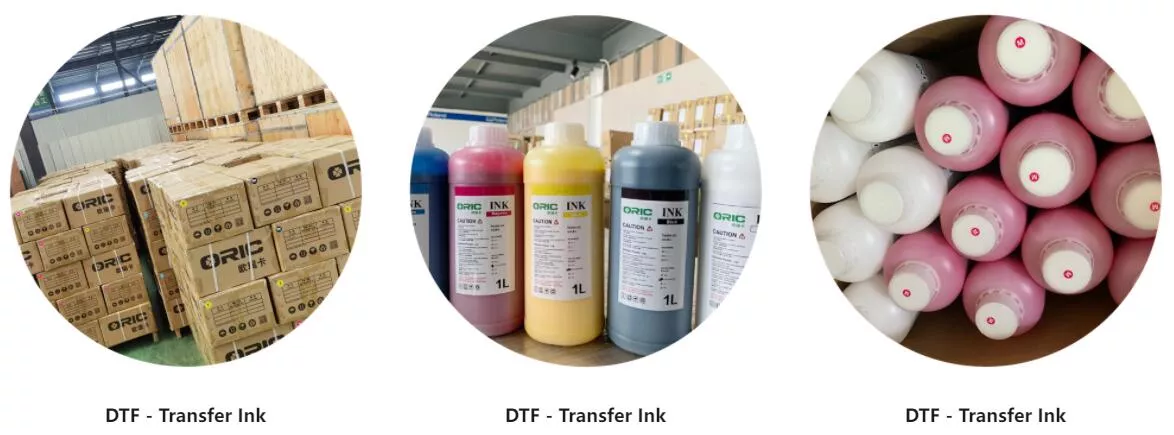 ORIC offers different colors of DTF inks such as white, yellow, black, magenta, cyan, orange, green, and also fluorescence pink & fluorescence yellow.